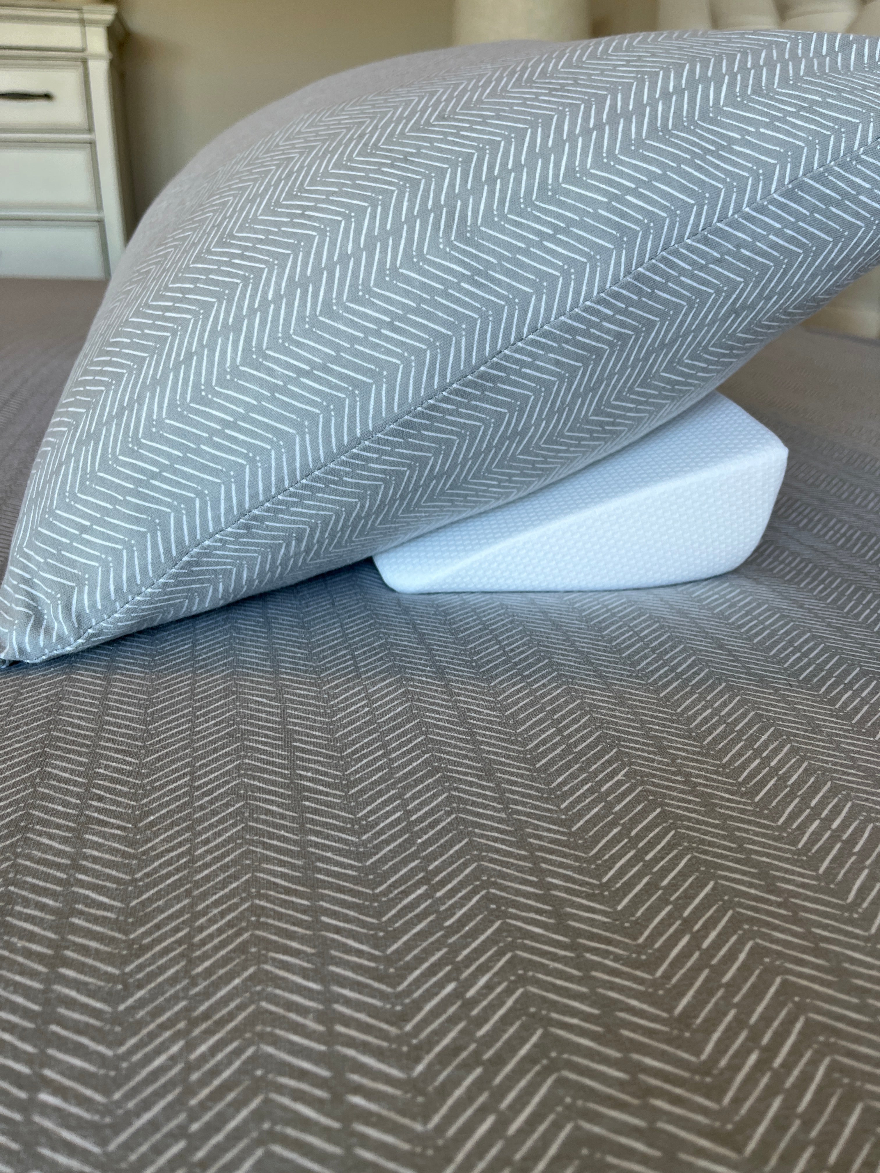 The SkipTheSnore wedge is placed underneath your pillow. The curved foam roll is designed to help you sleep comfortably on your side while discouraging back-sleeping. If you begin to roll onto your back, the foam roll applies gentle pressure encouraging you to return to your side. The wedge elevates the head with a balance of support and comfort. Includes a removable, machine washable cover that is open on the bottom for anti-slip traction. Patent Pending